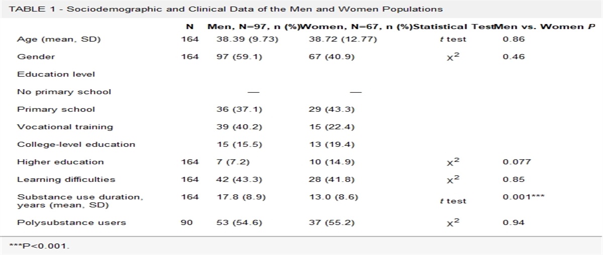 TABLE 1 - Sociodemographic and Clinical Data of the Men and Women Populations N Men, N=97, n (%) Women, N=67, n (%) Statistical Test Men vs. Women P Age (mean, SD) 164 38.39 (9.73) 38.72 (12.77) t test 0.86 Gender 164 97 (59.1) 67 (40.9) χ2 0.46 Education level No primary school — — Primary school 36 (37.1) 29 (43.3) Vocational training 39 (40.2) 15 (22.4) College-level education 15 (15.5) 13 (19.4) Higher education 164 7 (7.2) 10 (14.9) χ2 0.077 Learning difficulties 164 42 (43.3) 28 (41.8) χ2 0.85 Substance use duration, years (mean, SD) 164 17.8 (8.9) 13.0 (8.6) t test 0.001*** Polysubstance users 90 53 (54.6) 37 (55.2) χ2 0.94The majority of subjects used alcohol as a singlesubstance, with (89.4% among men and 80.0% among women). About half of the men (48%) and more than half of the women (55%) were polysubstance users. The majority of polysubstance users abused alcohol (ie, 80.0% among men and 62.2% among women) in addition to sedatives, cannabis, opioids, and stimulants.